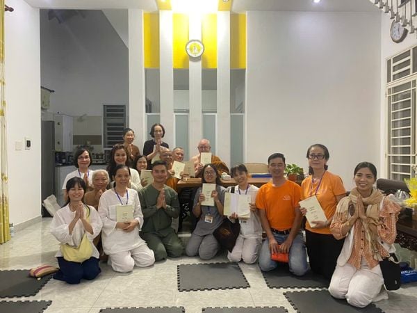 Cả đoàn cầm trên tay cuốn sách quý “Chánh niệm, Hỷ lạc và Giác ngộ” có chữ ký của Ngài, ngồi quanh Ngài trong tình Thầy trò Úc – Việt và cùng đồng thanh hô vang từ “tuyệt vời/ lành thay” bằng ngôn ngữ Pali: “Sadhu”