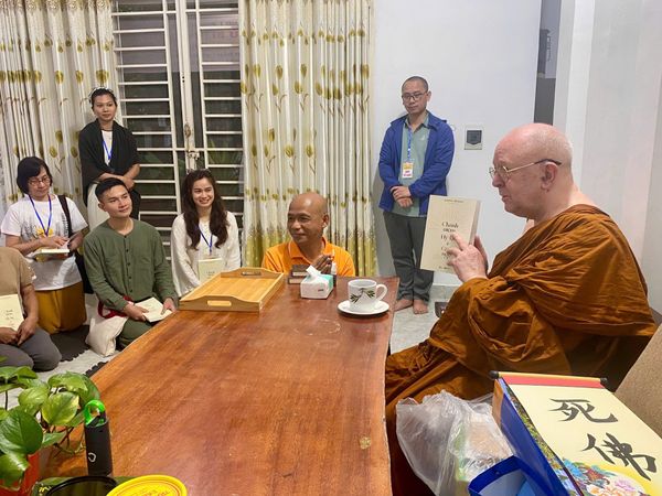 Trong những ngày này, đoàn Thái Hà Books đã có cơ hội gặp riêng và đảnh lễ Thiền sư Ajahn Brahm. TS. Nguyễn Mạnh Hùng - Chủ tịch Công ty Sách Thái Hà đã dâng lên Ngài những món quà được chuẩn bị kỹ lưỡng: Bức tranh Đức Phật Thích Ca Mâu Ni được chế tác bằng gạo, cuốn Kinh Pháp Cú bỏ túi bản tiếng Việt, Kinh Pháp Cú 03 ngôn ngữ Pali – Anh - Việt do Thái Hà Books ấn tống, và cuốn sách “Chánh niệm, Hỷ lạc và Giác ngộ” được xuất bản để chào mừng khóa thiền ở Việt Nam của Ngài.