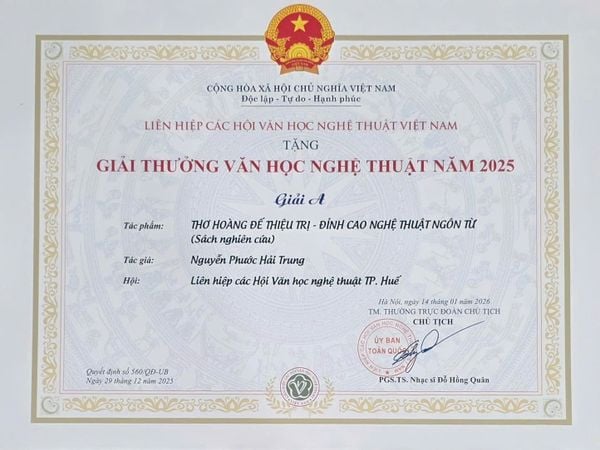 Sáng nay, ngày 14/01/2026 tại Hà Nội, trong không khí trang trọng của Lễ trao Giải thưởng Văn học Nghệ thuật năm 2025 do Liên Hiệp các Hội Văn học Nghệ thuật Việt Nam tổ chức, cuốn sách “Thơ Hoàng Đế Thiệu Trị – Đỉnh cao nghệ thuật ngôn từ” đã vinh dự được trao GIẢI A – giải thưởng cao nhất của hệ thống giải thưởng danh giá này.