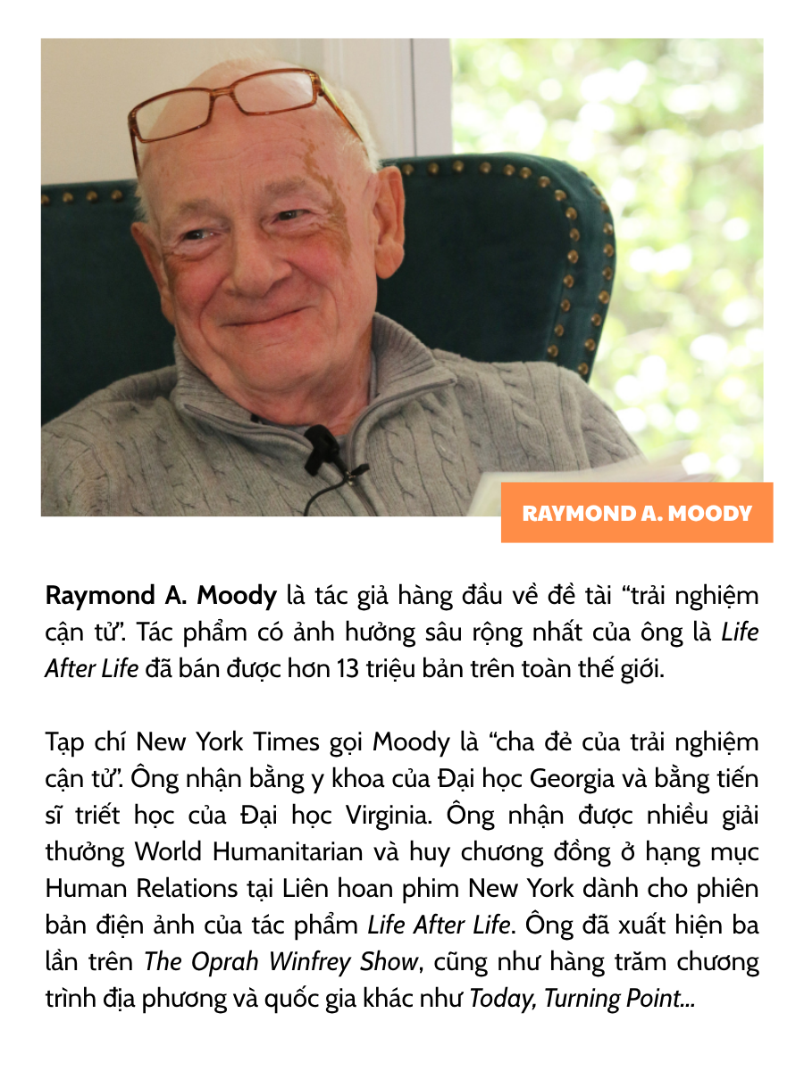 Raymond A. Moody là tác giả hàng đầu về đề tài “trải nghiệm cận tử”. Tác phẩm có ảnh hưởng sâu rộng nhất của ông là Life After Life đã bán được hơn 13 triệu bản trên toàn thế giới. Tạp chí New York Times gọi Moody là “cha đẻ của trải nghiệm cận tử”. Ông nhận bằng y khoa của Đại học Georgia và bằng tiến sĩ triết học của Đại học Virginia. Ông nhận được nhiều giải thưởng World Humanitarian và huy chương đồng ở hạng mục Human Relations tại Liên hoan phim New York dành cho phiên bản điện ảnh của tác phẩm Life After Life. Ông đã xuất hiện ba lần trên The Oprah Winfrey Show, cũng như hàng trăm chương trình địa phương và quốc gia khác như Today, Turning Point…