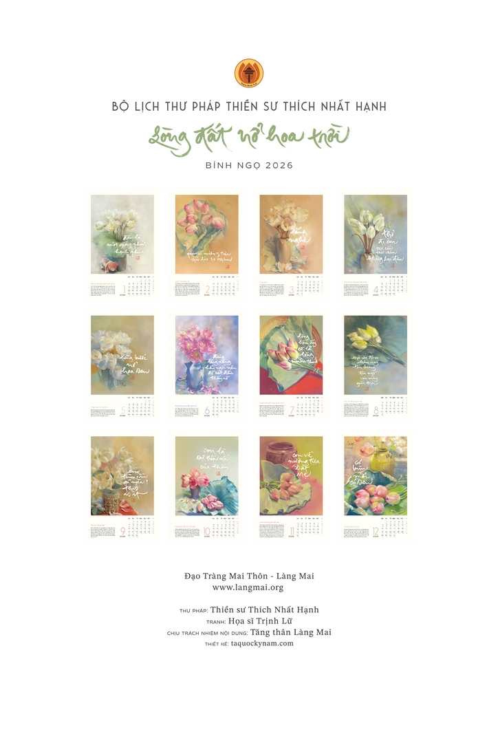 Năm nay, Tăng thân Làng Mai cùng Thái Hà Books trân trọng gửi đến bạn ấn phẩm lịch đặc biệt với chủ đề “Lòng đất nở hoa trời”. Mỗi tờ lịch không chỉ là một mốc thời gian, mà còn là một cánh cửa nhỏ dẫn về chánh niệm – nhắc ta dừng lại, thở sâu và sống thật.