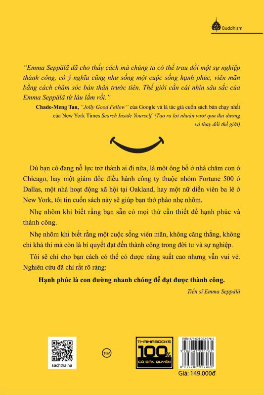 “Tiến sĩ Seppälä đã biến khoa học tiên tiến thành một cuốn sách thực tế, cấp tiến với những ảnh hưởng sâu sắc. Điều đáng chú ý là cảm giác hạnh phúc tốt cho sức khỏe, cho các mối quan hệ và cho công việc của chúng ta. Dựa trên nghiên cứu về khoa học thần kinh và tâm lý học, cũng như công trình mang tính đột phá của chính cô tại Stanford, Seppälä đã cho chúng ta sáu cách hiệu quả để biến hạnh phúc thành thành tựu lớn hơn.”