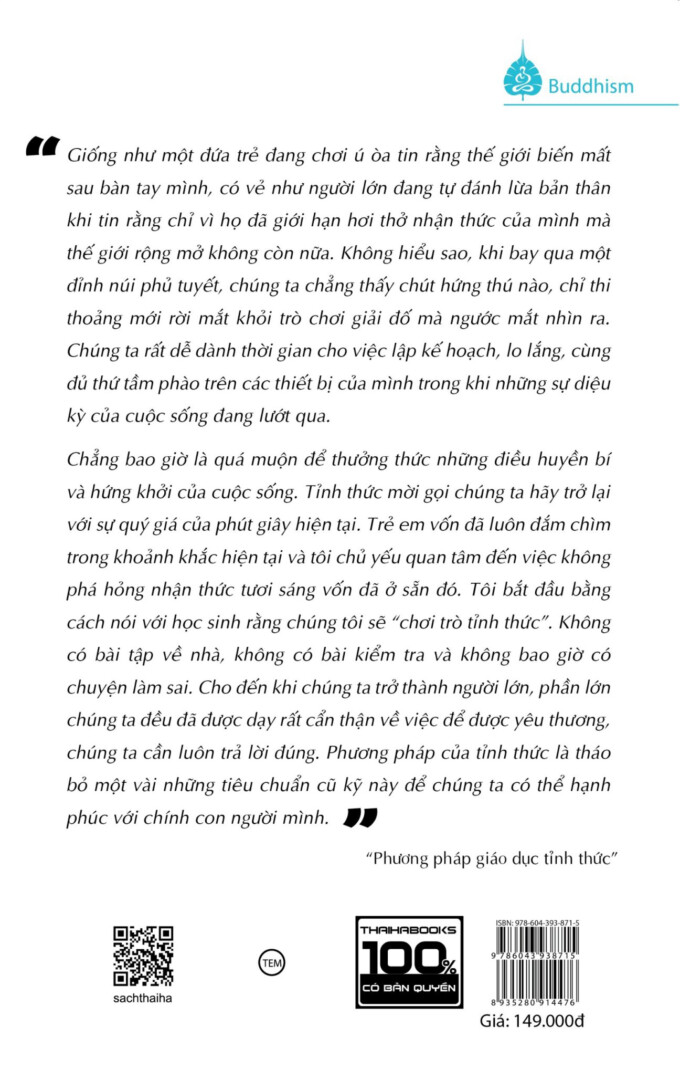 [ThaiHaBooks] Giáo dục tỉnh thức là một hướng dẫn thiết thực để nuôi dưỡng sự chú tâm, lòng trắc ẩn và hạnh phúc không chỉ ở những học sinh này mà còn ở chính giáo viên. Cuốn sách này đưa ra những ứng dụng thực tế của thực hành tỉnh thức trong chương trình giáo dục phổ thông bằng các giáo án, bài tập và các hoạt động phù hợp với nhóm tuổi cụ thể và học sinh có nhu cầu đặc biệt. Cuốn sách này mời các giáo viên, nhà quản lý và bất kỳ ai quan tâm đến giáo dục tận dụng những giá trị của tỉnh thức và trở thành những nhà giáo dục tỉnh thức và nhân ái..