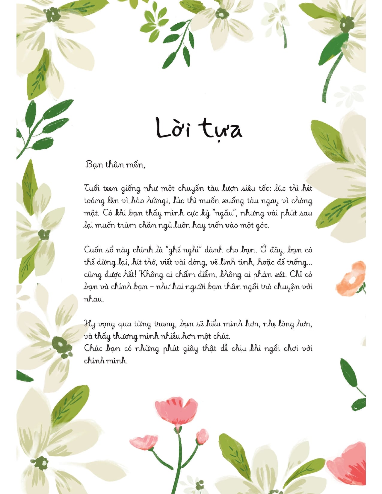 Cuốn sổ này chính là ghế nghỉ dành cho bạn. Ở đây, bạn có có thể dừng lại, hít thở, viết vài dòng, vẽ linh tinh, hoặc để trống…cũng được hết! Không ai chấm điểm, không ai phán xét. Chỉ có bạn và chính bạn - như hai người bạn thân ngồi trò chuyện với nhau.