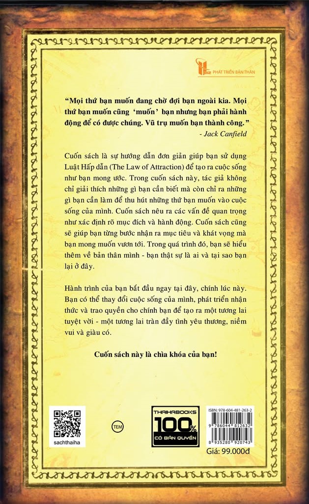 [Thaihabooks] Cuốn sách viết về cách hoạt động của Luật hấp dẫn trong cuộc sống của bạn, từ đó bạn có thể hiểu nhiều hơn về bản thân mình - thực ra bạn là ai và tại sao bạn lại ở đây. Cuốn sách này chính là chìa khóa của bạn. Nó có thể mở cánh cửa tới tương lai như bạn mong ước và đưa bạn tới con đường có nhiều niềm vui, sung túc và giàu có hơn. Khi đọc cuốn sách này, bạn sẽ thấy mình được truyền cảm hứng vì bạn nhận ra rằng bạn có thể tạo ra cuộc sống mà bạn khao khát, và bạn sẽ được trao quyền khi sử dụng những công cụ, những chiến lược và những khái niệm cơ bản được chuyển tải trong những trang sách này.